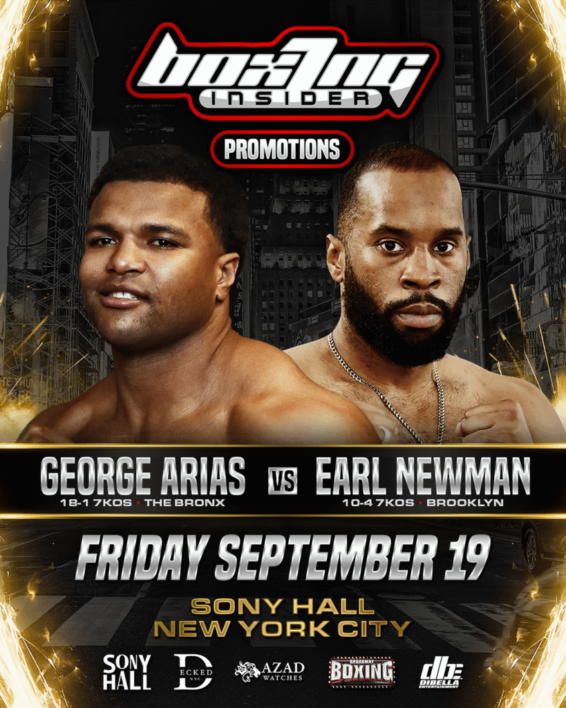 Live Boxing Returns to Times Square at Sony Hall on Friday, September 19th via Boxing Insider Promotions. George Arias (18-1-1, 7 KOs) from Bronx, New York, will be taking on Earl Newman (10-4, 7 KOs) in an explosive 8-round battle Heavyweight showdown.